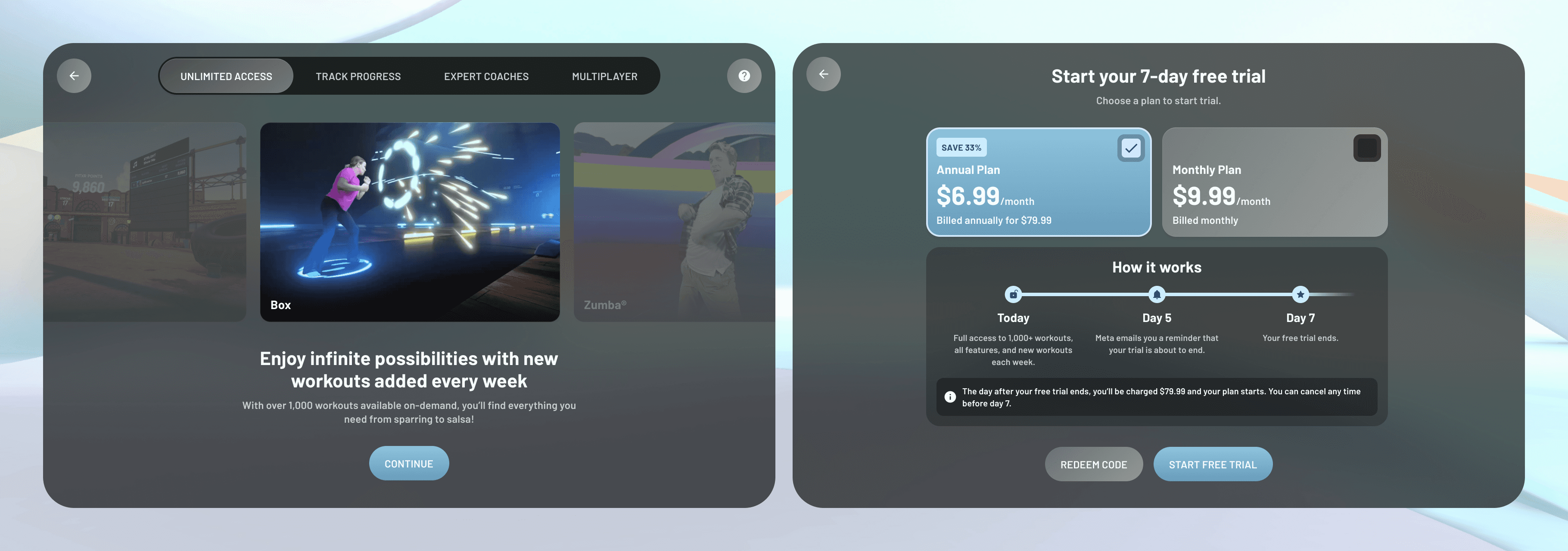 The new experience for FitXR 2.5 aims to solve three critical parts of onboarding: improving the environment, learning the movements, and convincing users to start the free trial. Let’s go deeper one by one.