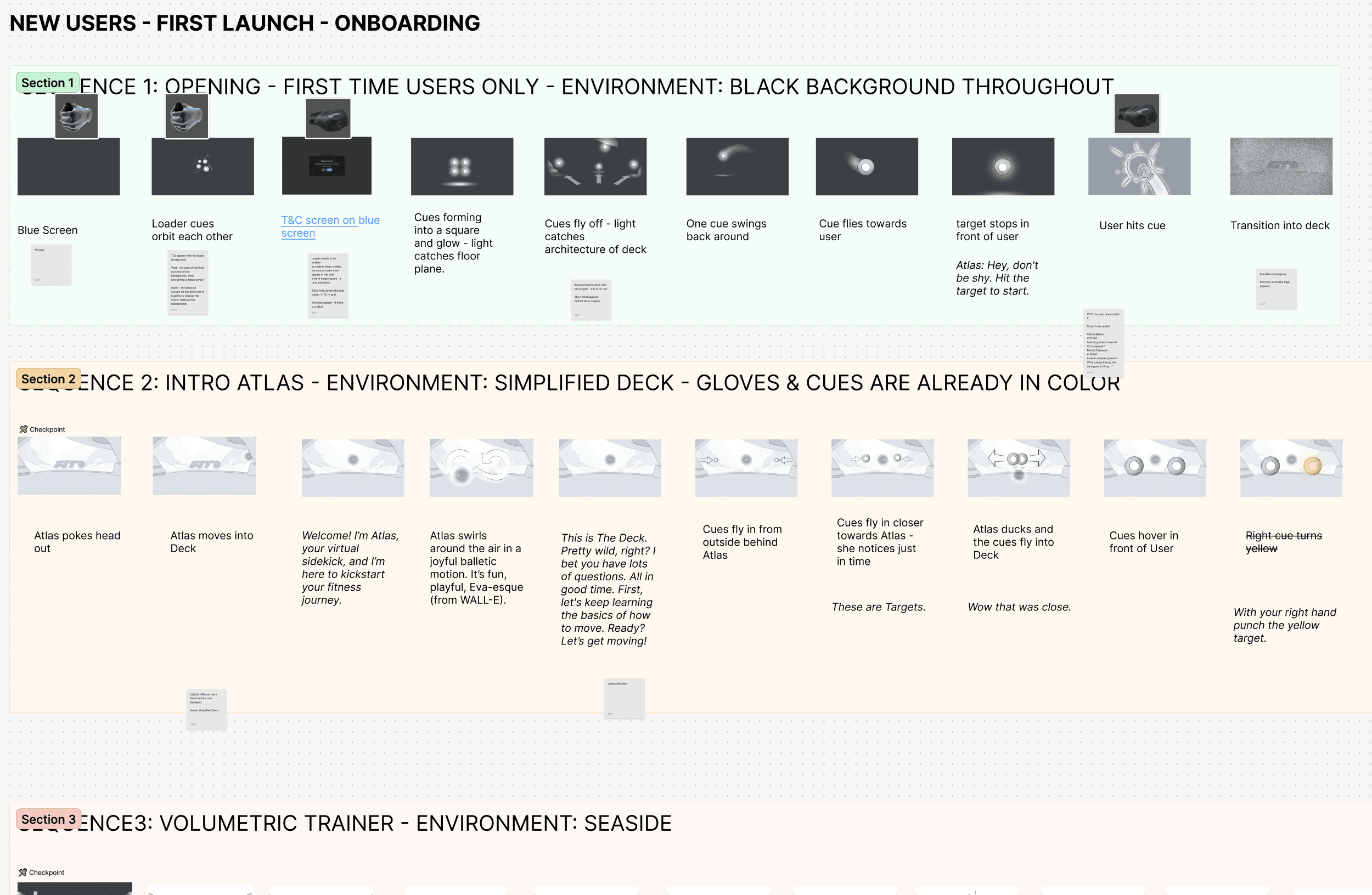 To streamline the process, I created a master storyboard that broke the onboarding flow into smaller sequences. This approach allowed the team to understand key checkpoints throughout the user journey, enabling users to resume from where they left off if they exited midway. For example, the storyboard detailed how the environment should change during certain moments and scripted what Atlas, the AI assistant, would say at critical points. This master storyboard served as the single source of truth, ensuring alignment and consistency across all teams involved in the onboarding process. I also conducted a workshop with the engineering and art team to coordinate and ensure that everyone is on the same page.